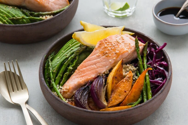 8. Schep de quinoa in een kom, leg er wat rode kool op en schep er de aardappel, rode ui, groene asperges en avocado bij. Leg hierop de zalmfilet en maak af met de dressing. Garneer met sesamzaad en geef er partjes citroen bij.