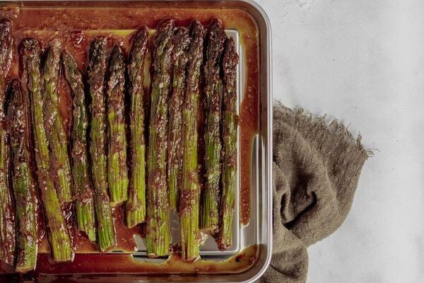 4. Leg de schoongemaakte asperges op een met bakpapier beklede bakplaat en druppel met een lepel het glazuur over de asperges. Zorg dat de asperges volledig zijn bedekt. Draai ze daarom ook om.