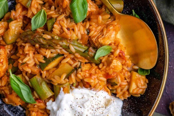 7. Serveer de orzo met kip met een deel van de burrata en garneer met een snufje zwarte peper en nog wat blaadjes basilicum.